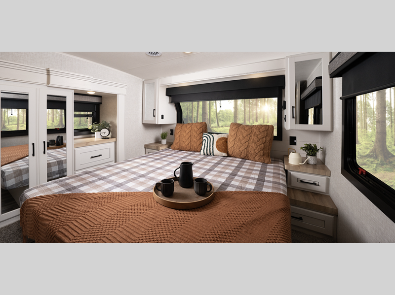 Sleeps 4 Slides 1 Length 29 ft 9 in Ext Width 8 ft 1 in Ext Height 12 ft 11 in Int Height 8 ft 6 in Interior Color Calli Linen Hitch Weight 1620 lbs GVWR 9650 lbs Dry Weight 8065 lbs Cargo Capacity 1585 lbs Fresh Water Capacity 52 gals Grey Water Capacity 82 gals Black Water Capacity 45 gals Tire Size ST225/75R15E Furnace BTU 35000 btu Available Beds Olympic Queen Refrigerator Type GE 12V Refrigerator Size 10 cu ft Shower Size 30" x 36" Number of Awnings 1 LP Tank Capacity 30 lbs Water Heater Type On Demand AC BTU 15000 btu TV Info LR 4K Ultra LED HD Smart TV Awning Info 16' Electric w/Integrated LED Lights Axle Count 2 Washer/Dryer Available Yes Number of LP Tanks 2 Shower Type Standard Electrical Service 50 amp Similar Floorplans